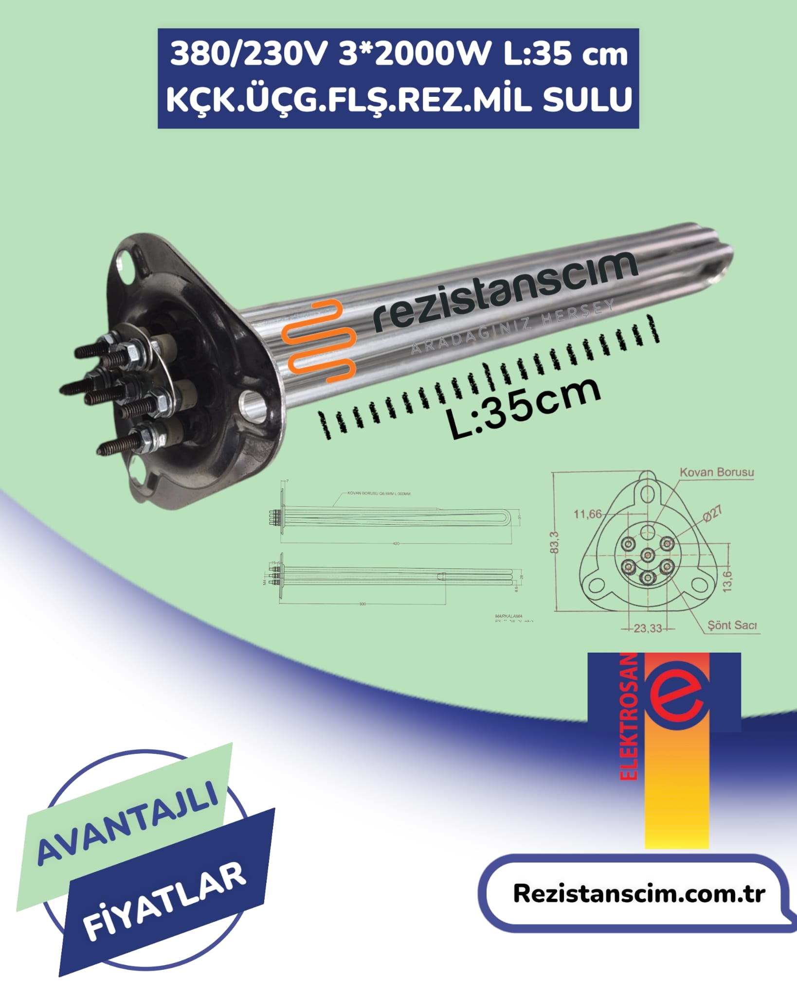 6 Kw Ücgen Flanş K Ücgen 35 Cm Bulaşık Makinesi Boiler Rezistans (ELEKTROSAN MARKA)