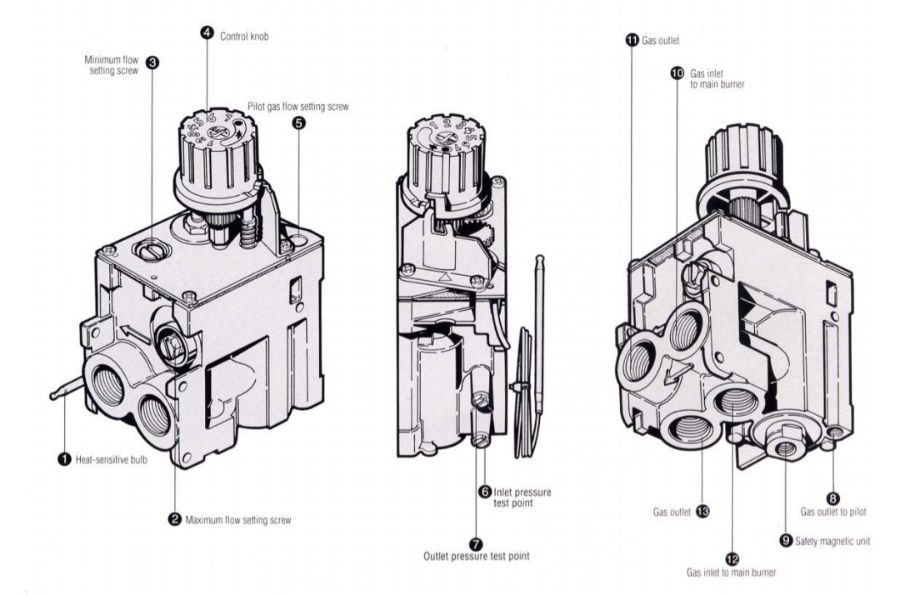 Termoelektrik alev denetleme cihazı ve modülasyonlu ve AÇMA-KAPAMA termostatı ile tek düğmeli (KAPALI, pilot, sıcaklık seçimi) çok fonksiyonlu kontrol.